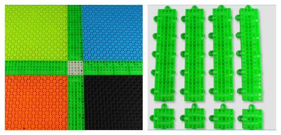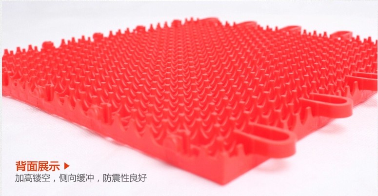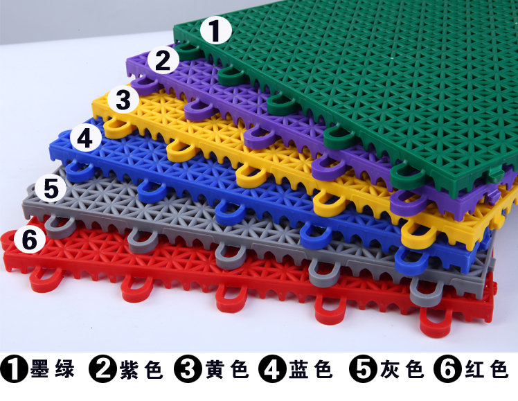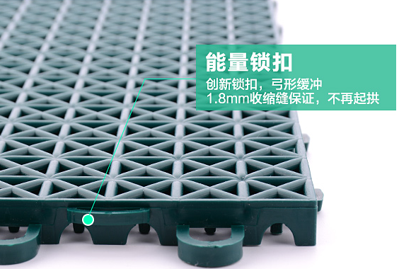 ![]() | 采用環保進口PP材質,具有韌性好,顏色鮮艷,不易變形,特別添加抗老化成份,抗紫外線,經久耐用,通過國家體育用品質量監督檢驗中心檢測,抗紫外線、抗老化、耐寒等性能優異。 可直接鋪在水泥或瀝青的基礎表面,無需粘接,每一塊地板之間用鎖扣連接,顏色隨意搭配,隨意更換安裝維修簡單方便。 |