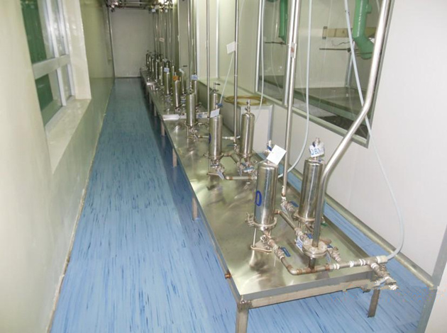 水在制藥工業中是應用廣泛的工藝原料,用做藥品的成份、溶劑、稀釋劑等。在洗瓶室、洗 刷間、滅前間、物料凈化室等區域存在大量用水問題,因些,材料及地坪輔料防水性能要求極高,以往用R條作封閉踢腳會導致大量水滲透至其余相鄰房間,不建議使用。